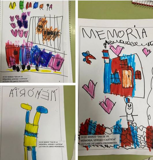En Primaria, las y los estudiantes de 7° grados analizaron el contexto histórico de la dictadura de manera transversal en Ciencias Sociales y Prácticas del Lenguaje. Reflexionaron sobre canciones y cuentos prohibidos y elaboraron sus producciones.