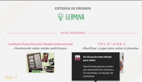 En el marco del proyecto institucional Salud y medioambiente y durante el ciclo lectivo 2020 nuestra escuela fue ganadora del Premio Germina. Es un premio de innovación sustentable y de promoción para el aprendizaje en servicio que impulsa del Gobierno de la Ciudad de Buenos Aires a través del programa Escuelas Verdes.
