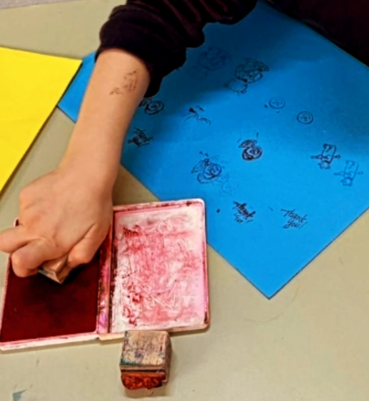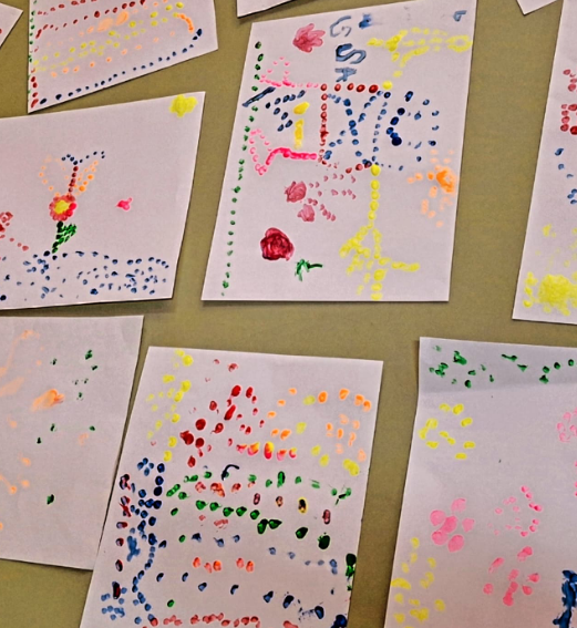 En el taller de Arte de las salas de 5 años, los grupos se adentraron en SELLOS, PUNTOS y LÍNEAS aplicando técnicas de estampado y trazado con distintos materiales y soportes. Enfocaron en la exploración y la expresión, y también en ejercitar la mirada y soltar la mano, con el propósito de favorecer la prensión y ajustar paulatinamente las grafías hacia la escritura.