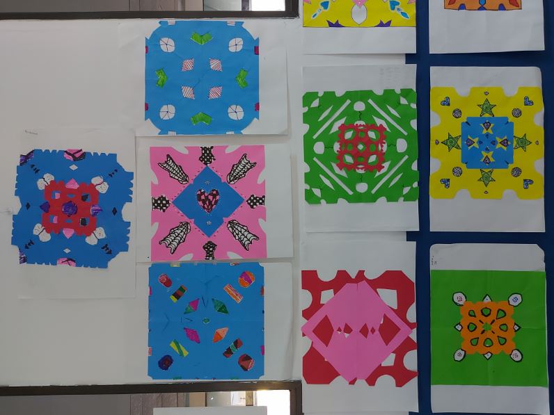 - Los y las  estudiantes de 7° hicieron lo suyo con simetría axial y central. Esta actividad se realizó en plástica.
